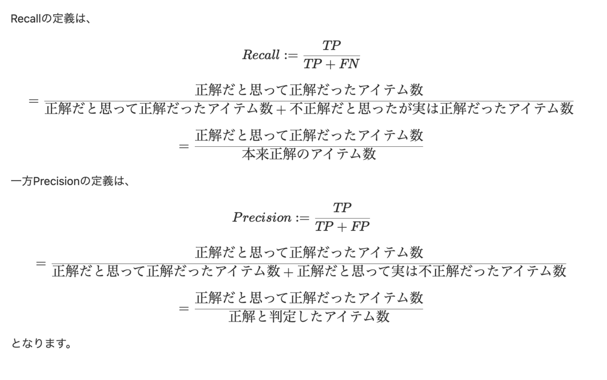 Precision@k と Recall@k の定義の違いを考えると、異なる部分は分母のうち、正解データに絞るかどうかという点です。