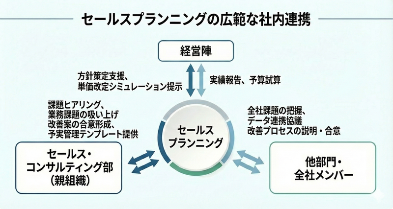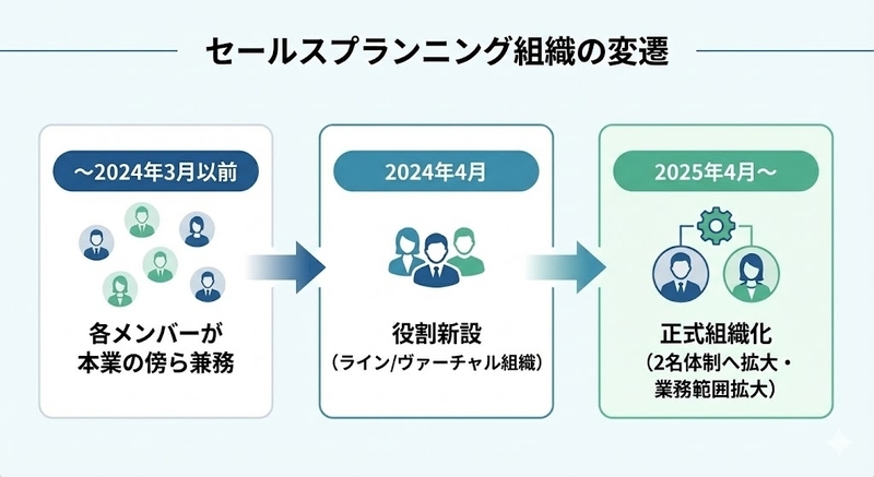 今回初めて私の記事を読んでいただく方のために、まずはセールスプランニング新設の経緯を簡単にご説明したいと思います。 私が所属している「セールス・コンサルティング部」は文字通り営業やコンサルタントが所属する部署であり、案件対応を通じて売り上げを立てることが主な役割(主務)です。 一方で、組織を運営するためには営業活動以外にも管理、企画、改善、育成などの様々な業務が必要です。 私が2023年9月に入社した当時はメンバーそれぞれが主務の傍らそれらを対応していましたが、人数の拡大や各種ルールの整備に伴い、専門的な役割を設けて対応することで最適化を図るべく、セールスプランニングが新設されました。 2024年4月に新設された時点では正式な組織としてではなく「ライン」と呼ばれるヴァーチャル組織のような位置づけでしたが、2025年4月より晴れて正式な組織となり、現在私はチームリーダーを務めさせていただいています。 メンバーも一人増え、現在は2名体制の組織となっています。